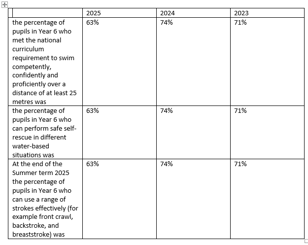At the end of the Summer term 2025 the percentage of pupils in Year 6 who met the national curriculum requirement to swim competently, confidently and proficiently over a distance of at least 25 metres was 58%