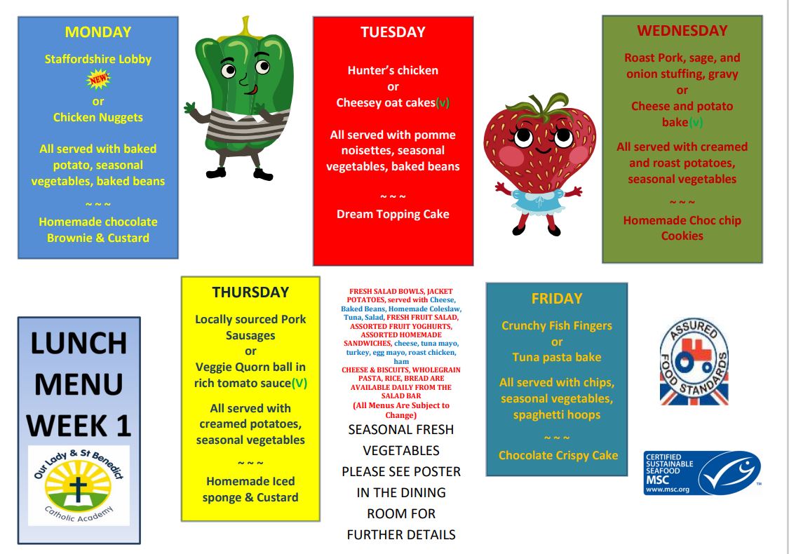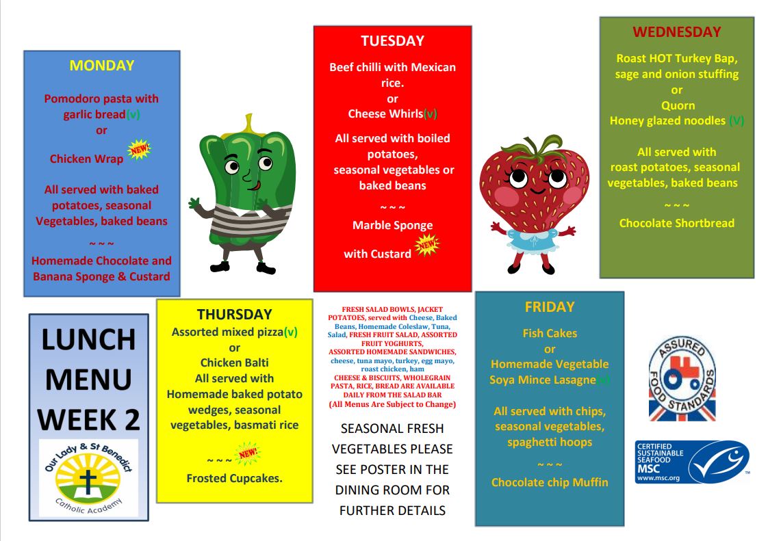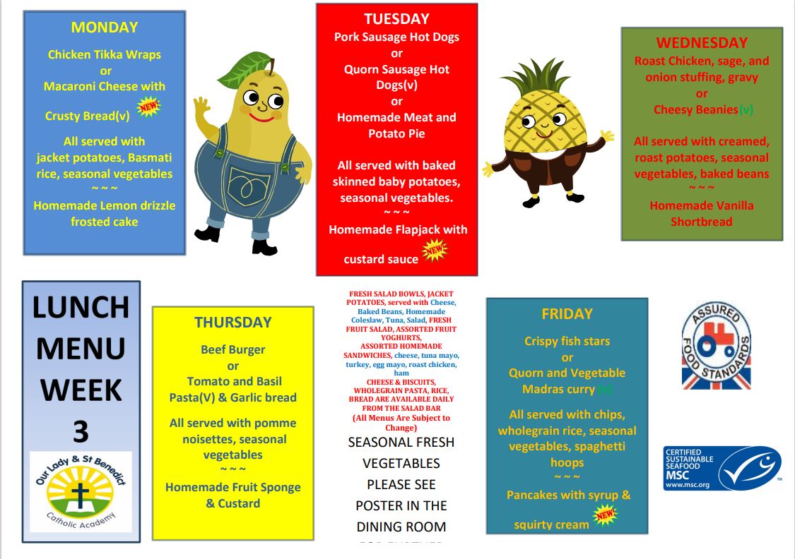 Our school lunches are made fresh each day on site using produce from local suppliers. The menu's below are served on a three week rotation.